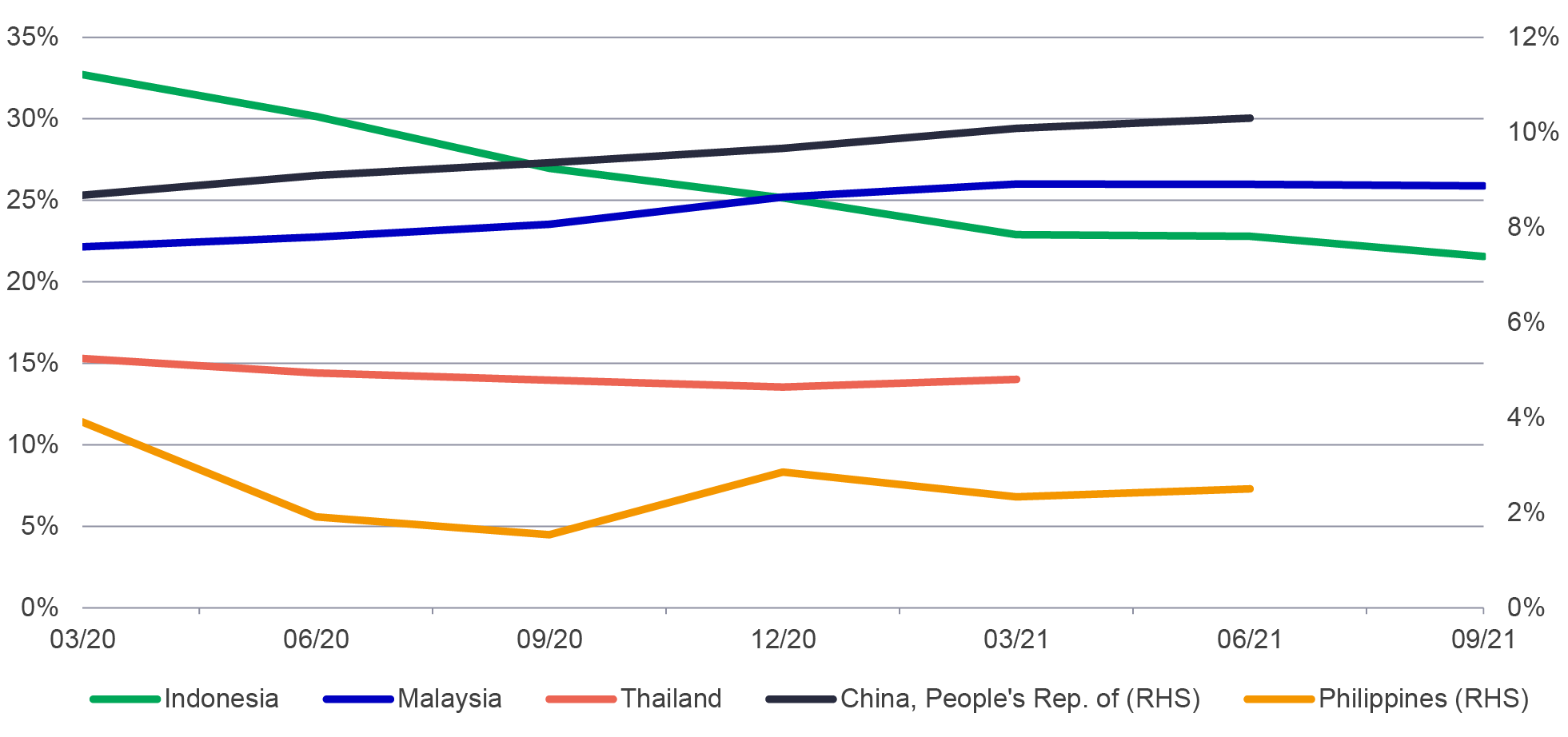 The newly adopted policies, coupled with a surge in commodity prices, resulted in the country posting its largest quarterly current account surplus in 12 years in the third quarter (1.5% of GDP). In addition, Bank Indonesia’s purchase of government debt has significantly reduced foreign ownership, from approximately 27% in September 2020 to roughly 21% in September 2021 (see Chart 3), with the central bank owning more rupiah debt for the first time ever; this has notably decreased volatility for local-currency bonds and stabilized the rupiah.