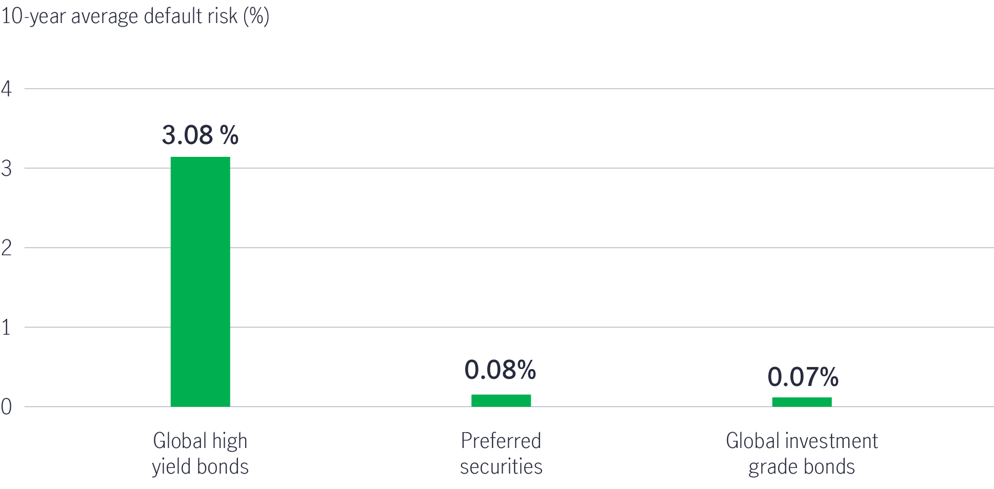 4 Source: Global high yield bonds are represented by ICE BofA Global High Yield Index; Global Investment grade bonds represented by ICE BofA Global Corporate Bond Index; Preferred securities are represented by ICE BofA US All Capital Securities Index. Default rates for global high yield bonds and global IG corporate bonds sourced from Moody’s, as of 30 June 2024. Preferred default rates for preferred securities were calculated by Manulife Investment Management based on ICE BofA US All Capital Securities Index, as of 30 June, 2024. Calculated annually. Past performance is not indicative of future performance. It is not possible to directly invest in index.