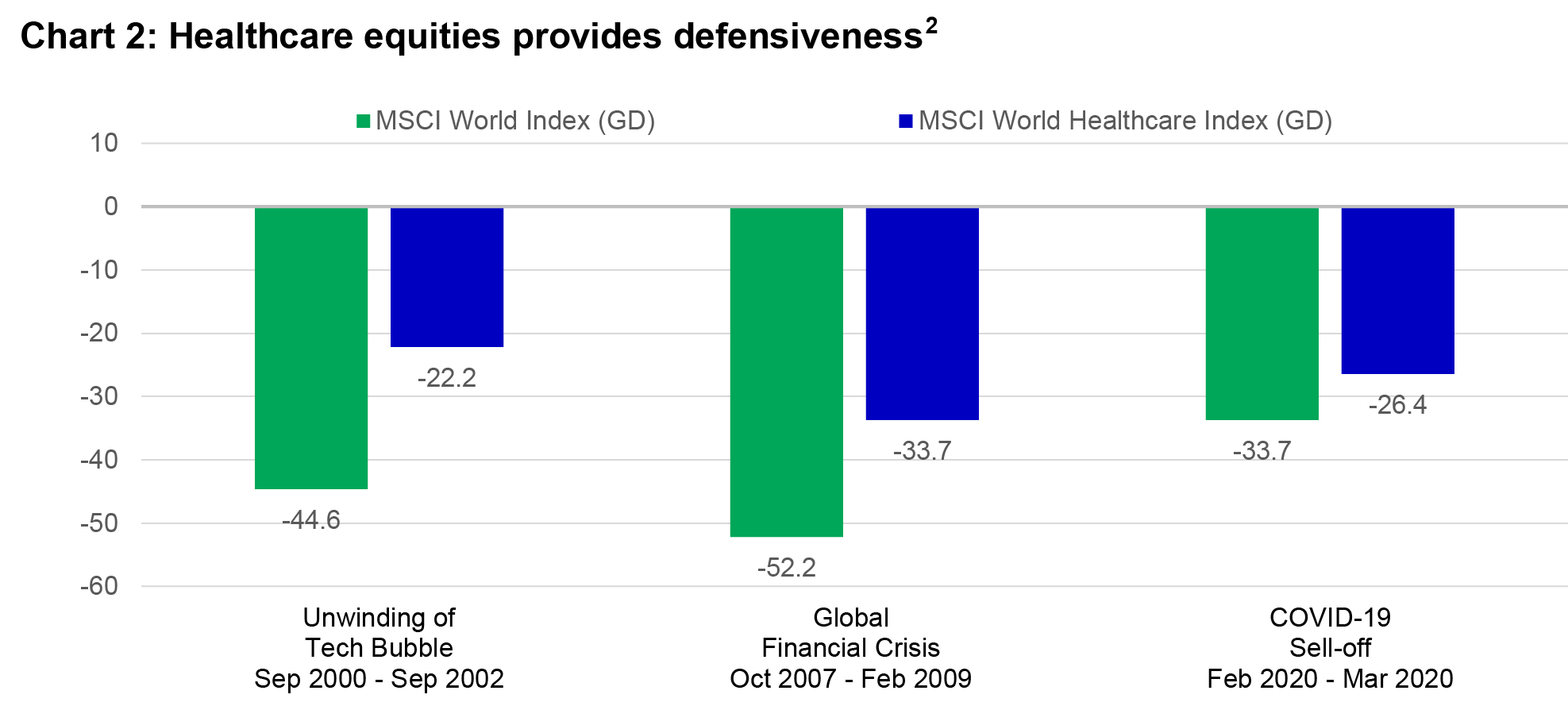 The sector's defensiveness stems from the supply-and-demand dynamic of healthcare products and services. While cyclical industries usually experience a sizable reduction in demand during economic downturns, healthcare demand generally remains resilient, with consumers having an inelastic appetite for medical goods and services. This has been even more prominent during the COVID-19 pandemic with many healthcare products and services experiencing a surge in demand.
