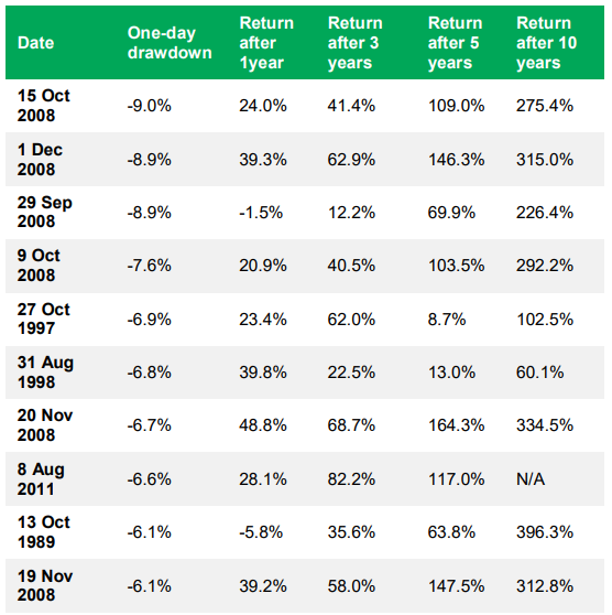 At this stage, we expect a market rebound when more certainty returns. We don’t have a crystal ball on when this might occur, but we believe that we’re closer to the end of the correction than the beginning. Crucially, historical market performance of equities after steep market sell-offs of this magnitude certainly suggests that a rebound will take place. Historical data also shows that when stock markets come back, the rebounds are typically sharp, sustained, and can happen very quickly. What history has taught us is that despite our emotional responses, it makes sense to stay invested, particularly for those with a longer investment horizon.