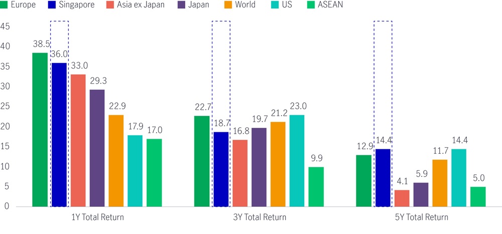 1 Source: Bloomberg, as of December 31, 2025. Performance in US dollars. Europe = Euro Stoxx 50 Index, Singapore = FTSE ST All Share Index, Asia ex Japan = MSCI AC Asia ex Japan Index, Japan = Nikkei 225 Index, World = MSCI AC World Index, US = S&P 500 Index, ASEAN = MSCI AC ASEAN Index.